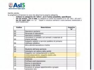 Nel documento per accedere alla vaccinazione anti-Coronavirus vengono elencate 30 categorie di persone. Tra i soggetti con “comportamenti a rischio”, al punto numero 10, sono stati inseriti anche gli omosessuali insieme a tossicodipendenti e ai “soggetti dediti alla prostituzione”. Il direttore dell’azienda sanitaria spezzina: “Un chiaro errore, lo riconosciamo”.